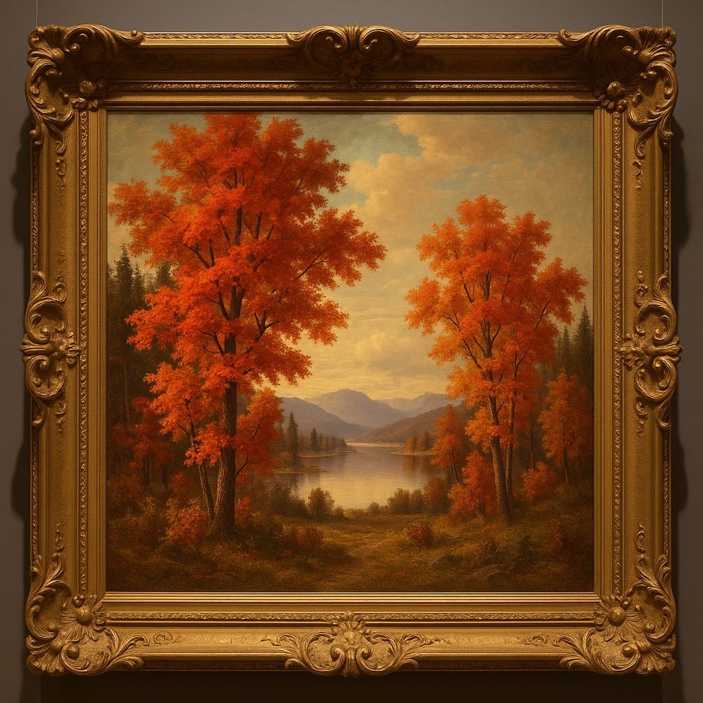 An evocative oil on canvas depicting a quintessential Canadian autumn scene with vivid maple trees reflected in a still lake. Painted in the tradition of the Group of Seven, with bold brushwork and rich, saturated colours. Housed in an ornate period gilt frame. Signed lower right (artist research ongoing). Canvas: 60cm x 45cm. Framed: 75cm x 60cm.