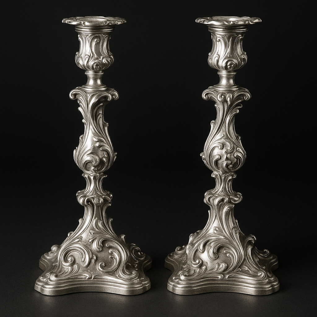 An elegant pair of Georgian sterling silver candlesticks with removable nozzles. The bases feature exquisite Rococo scrollwork with acanthus leaf details and shell motifs. Each candlestick bears clear London hallmarks dating to 1790. Weighted bases ensure stability. Height: 26cm each. Combined weight: 1.2kg.
